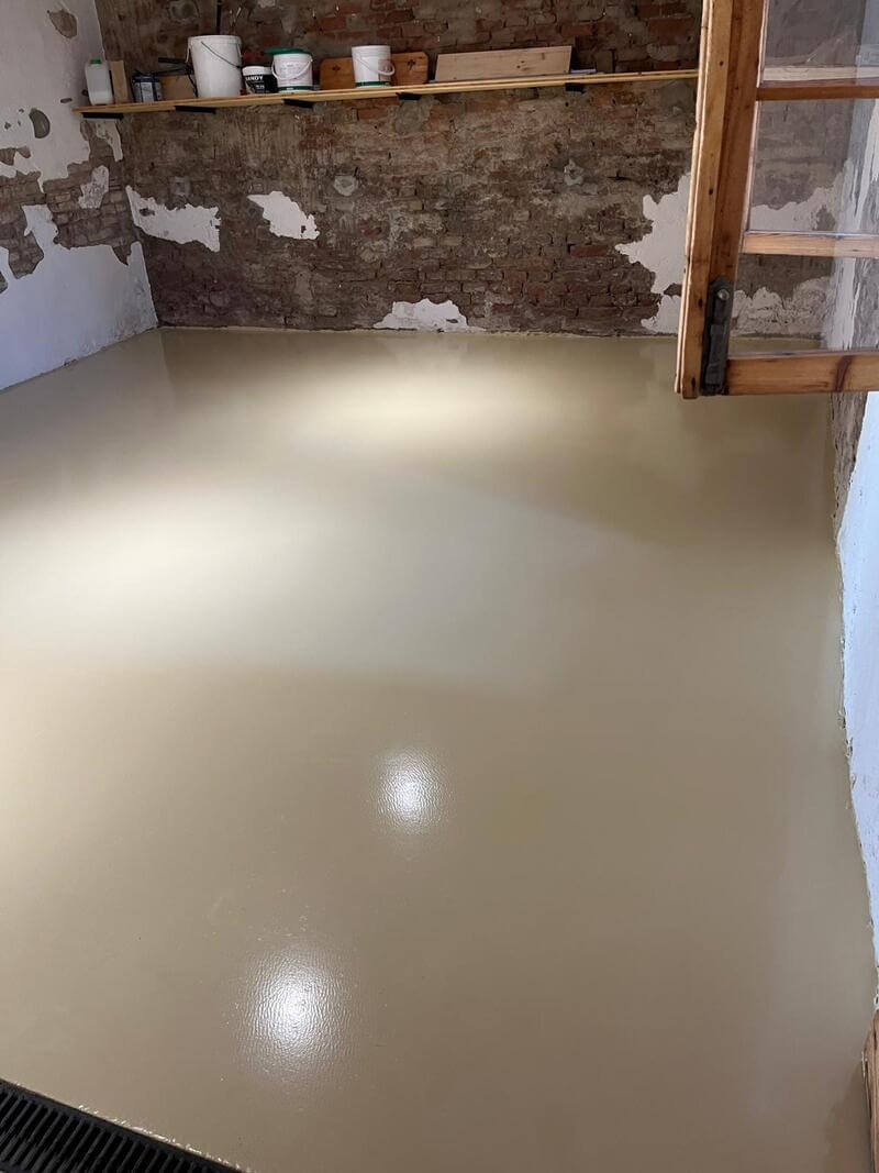 Intervento di ripristino pavimentazione in rimessa auto con problemi di umidità e carichi medio-pesanti, realizzato con barriera al vapore epossicementizio e rivestimento autolivellante epossiamminico.