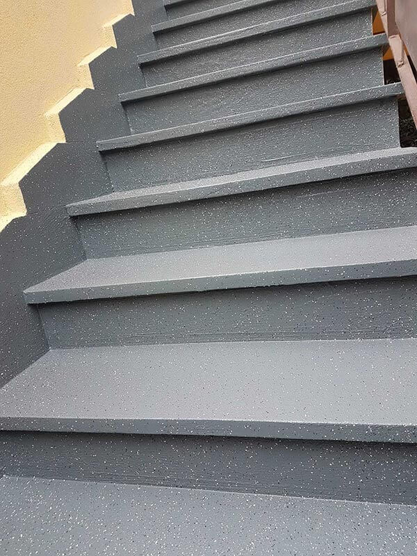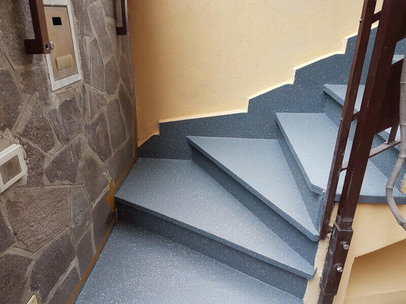 Ripristino impermeabile ed estetico di una scala senza demolizione con rivestimento autolivellante in PMMA, garantendo durabilità e resistenza agli agenti atmosferici.