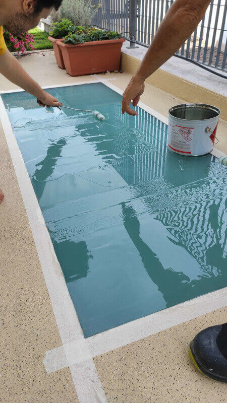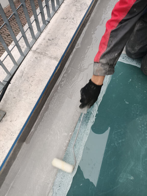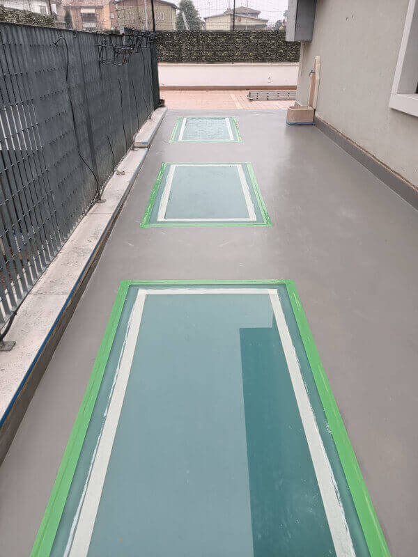 Impermeabilizzazione terrazza senza demolizione con sigillatura vetrate a filo pavimento, usando rivestimento autolivellante in PMMA e finitura trasparente poliuretanica.